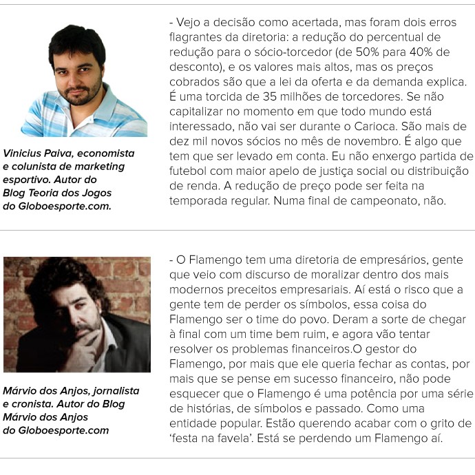 Vinicius Paiva, economista e colunista de marketing esportivo, e autor do Blog Teoria dos Jogos do GLOBOESPORTE.COM, é a favor da decisão da diretoria de aumentar os preços das entradas para a finalíssima. Apesar de contestar o valor máximo, de R$ 800 – setor Maracanã Mais, e a redução do desconto para o sócio-torcedor, de 50% para 40%, vê a iniciativa como apropriada para o momento.