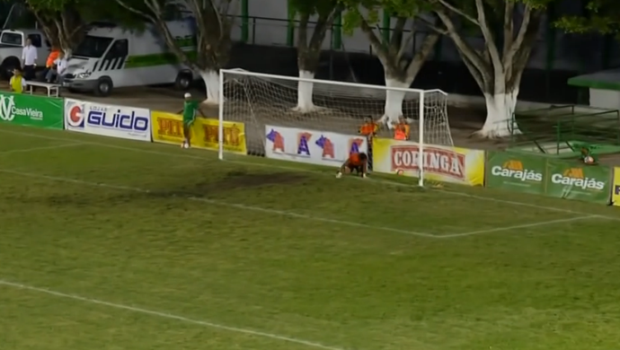 Léo, do Murici, vai parar dentro do gol com bola e tudo (Foto: Reprodução SporTV)