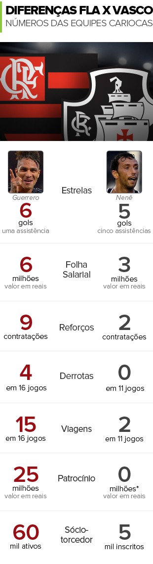 Não que antagonismo na história do Clássico dos Milhões seja novidade. Da distância de São Januário, na Zona Norte do Rio, até a Gávea, na Zona Sul; à diferença de personalidades que vão de Eurico e Bandeira, de Nenê e Guerrero e até dos capitães Rodrigo e Wallace, Vasco e Flamengo voltam a exibir particularidades que marcam esta rivalidade centenária. Há grande diferença no modelo de administração dos dois clubes. E também, hoje em dia, nas receitas. O Rubro-Negro tem folha salarial de cerca de R$ 6 milhões – a dos vascaínos fica em torno da metade dessa cifra. Dos dois lados, pelo menos até este momento do ano, os salários estão em dia. Em comum, perdas recentes de receitas – a Viton 44 não renovou com o Flamengo e fez acordo para deixar a camisa do Vasco e rescindir contrato.