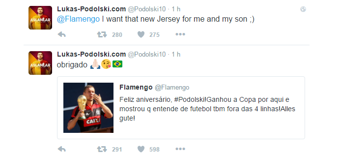 Esbanjando simpatia, o atacante Podolski deixou sua marca na passagem da Alemanha pelo Brasil em 2014, principalmente junto à torcida do Flamengo, depois de aparecer vestindo a camisa do clube em algumas oportunidades. E o jogador do Galatasaray, um dia depois de completar 31 anos, deu uma nova demonstração de carinho pelo clube carioca. "Poldi" recebeu desejo de feliz aniversário da conta oficial do Fla no Twitter e respondeu na manhã deste domingo, dizendo que deseja dois exemplares da nova camisa rubro-negra: uma para ele e outra para seu filho.