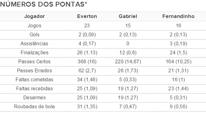 Nas estatísticas, Fernandinho tem melhor média em finalizações, assistências e faltas recebidas. No quesito, passe para gols, está empatado tecnicamente com Everton, que se destaca em passes certos, roubadas de bolas e faltas cometidas. As duas últimas categorias mostram a importância defensiva do camisa 22. Gabriel é o líder de desarmes do trio. Todos marcaram duas vezes cada. Confira tabela abaixo: