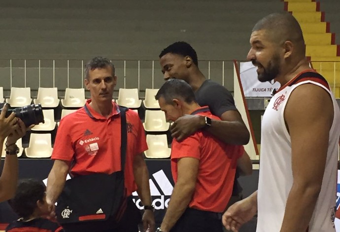 José Neto abraça Meyinsse no fim do jogo em quadra (Foto: Gabriel Fricke)