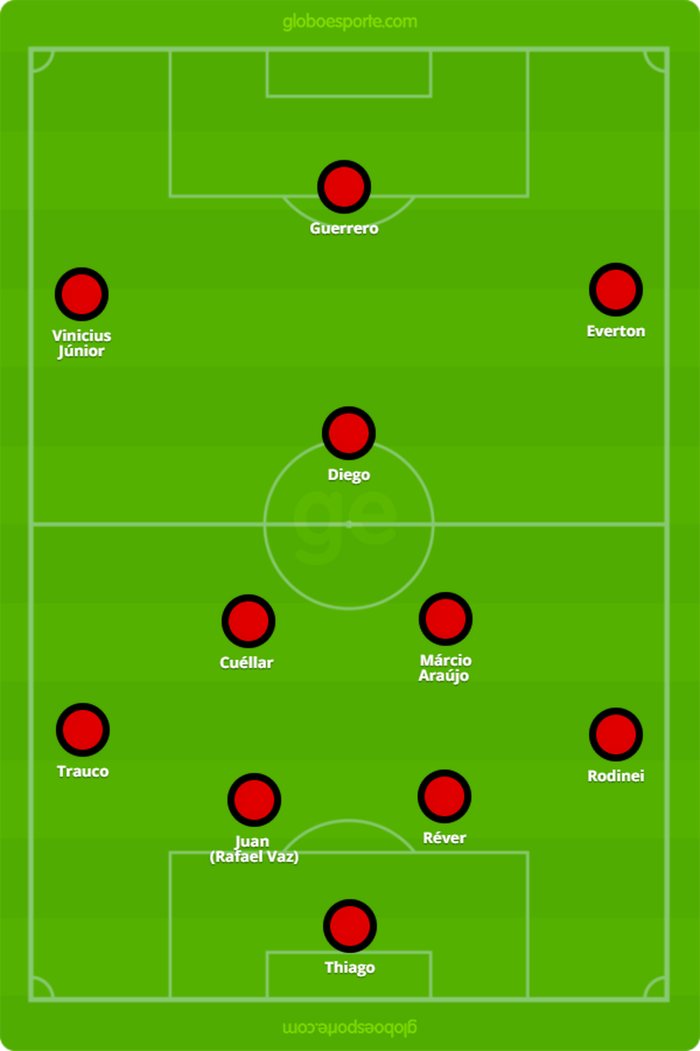 O time deve ir a campo com Thiago, Rodinei, Réver, Juan (Rafael Vaz), Trauco; Márcio Araújo, Cuéllar, Diego; Vinicius Junior, Everton e Guerrero.