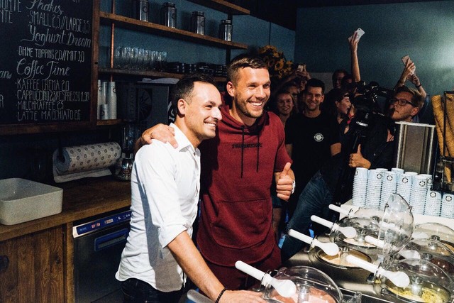 Primeiro veio uma marca de roupas esportivas e streetwear, a Strassenkicker, que sempre carrega frases de valorização aos moradores locais e, claro, ao clube que o formou. Agora, Poldi abriu também uma sorveteria, que traz no cardápio opções como “Effzeh” [termo usado pelos torcedores do Colônia] e tem desenhos e fotos da carreira do jogador na decoração descontraída, nas paredes e até no teto. Ele brinca sobre a possibilidade de expandir os negócios para o Rio.