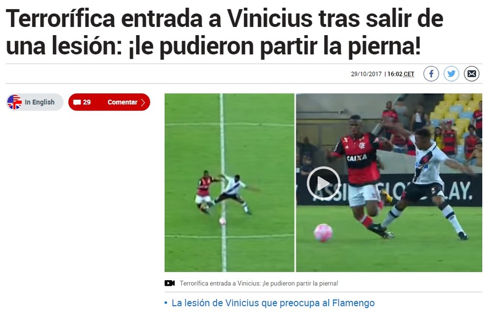 O “Marca” descreveu o lance como “terrível entrada em Vinicius depois de sair de uma lesão: podiam partir a perna”. No texto, o diário lembra que a jovem promessa rubro-negra sofreu com lances violentos em partidas passadas e destacou que o próprio jogador se revoltou com Wellington. O “As” escreve que “desse jeito não chega ao Madrid” ao comentar a “entrada selvagem” em Vinicius.