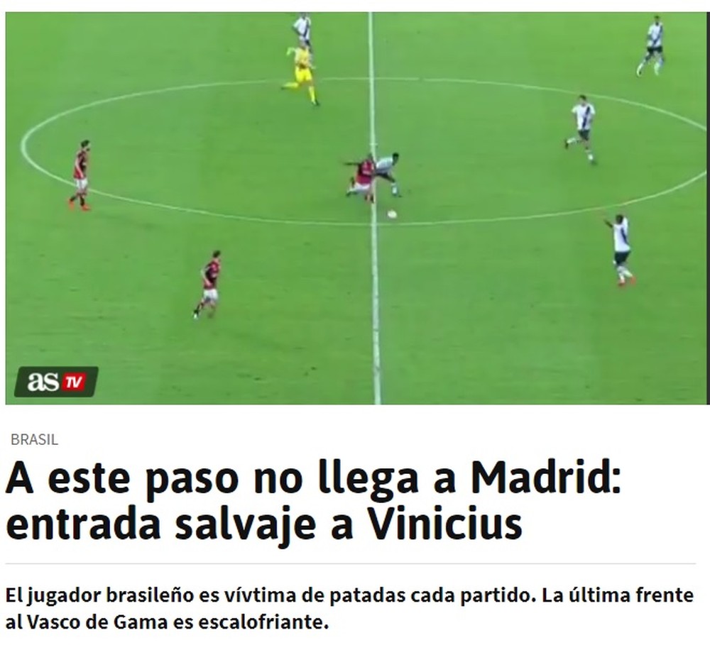 A imprensa espanhola não tira o olho de Vinicius Junior. Os jornais “Marca” e “As”, de Madrid, destacaram a dura entrada do volante Wellington, do Vasco, em cima do jovem atacante do Flamengo, no empate por 0 a 0 no clássico carioca, neste sábado.