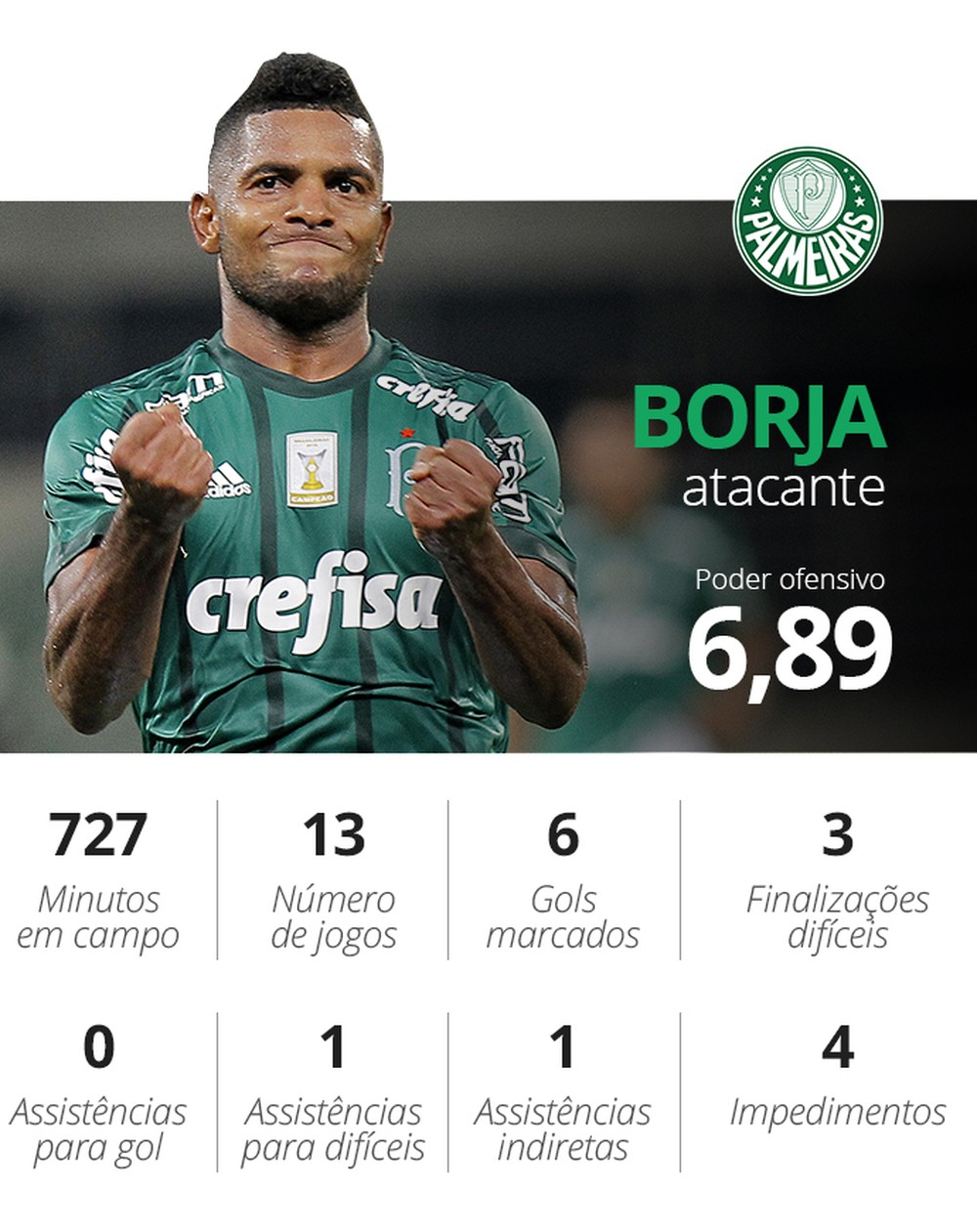 Às vésperas de um dos maiores clássicos do Brasil, o corintiano Jô e o palmeirense Borja aparecem na terceira e na quarta colocações, respectivamente. Jô é o atacante que mais gols fez em casa entre os primeiros colocados em poder ofensivo, dez, mas além de ter menos assitências para gol (uma) ele jogou muito mais tempo (14 jogos, 1.300 minutos) como mandante e foi flagrado em mais impedimentos (11). O Corinthians tem o segundo melhor desempenho entre os mandantes (9 vitórias, quatro empates e apenas duas derrotas em 15 jogos). Jô jogou quatro partidas a mais em casa na comparação com Guerrero (40%), mas o número de minutos a mais chega quase a 50%. A relação entre desempenho e tempo em campo é fundamental para determinar quem foi melhor.