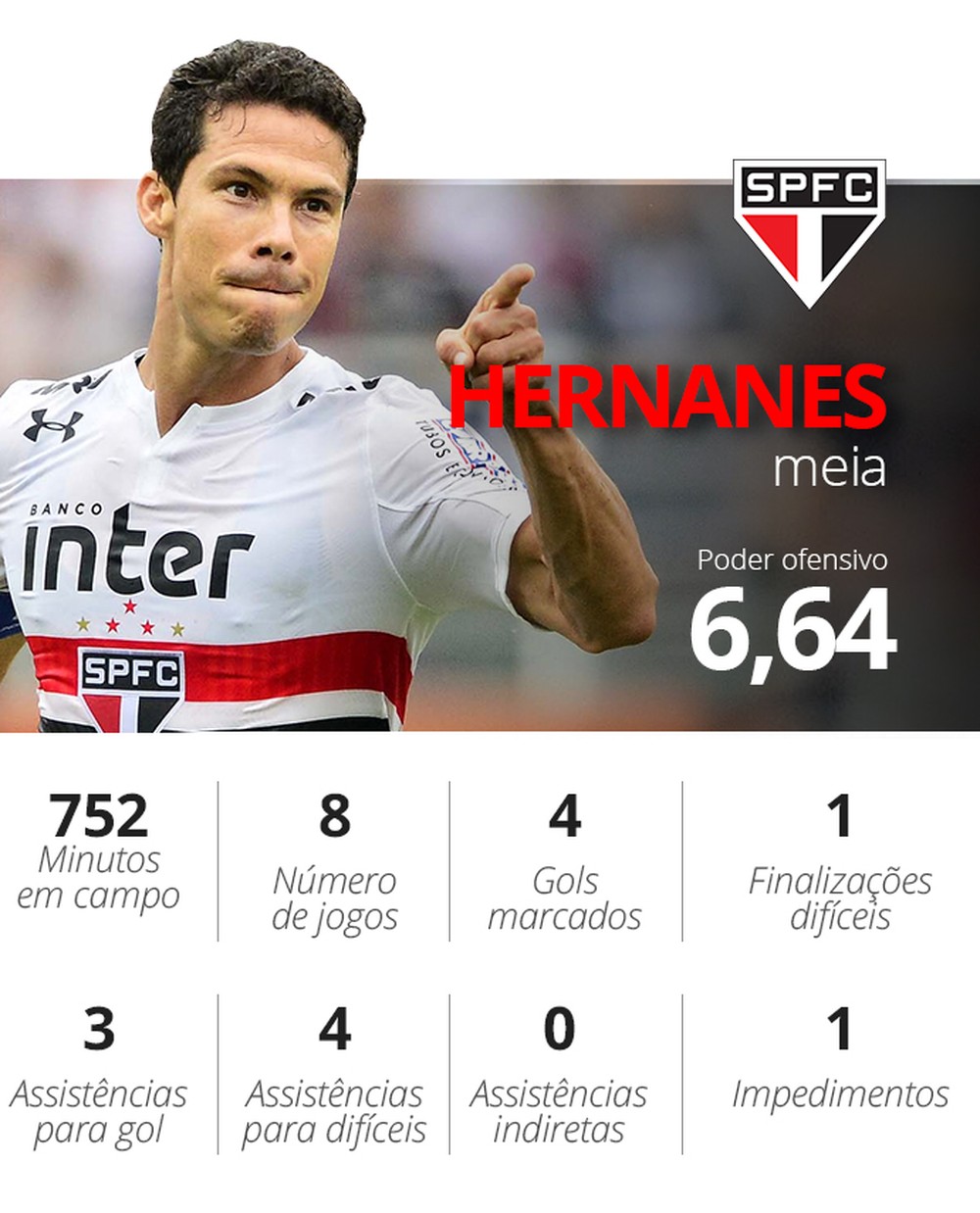 A participação dos jogadores resultou em uma pontuação (90,20 no caso de Hernanes), que foi dividida pelo número de minutos que ele esteve em campo (1.408 no caso dele). O resultado foi multiplicado por cem para dar um número fácil de ser compreendido (6,41 é o poder ofensivo de Hernanes). Para fazer parte da lista, um jogador precisava ter atuado pelo menos 40% do número de minutos do jogador de linha que esteve mais tempo em campo.