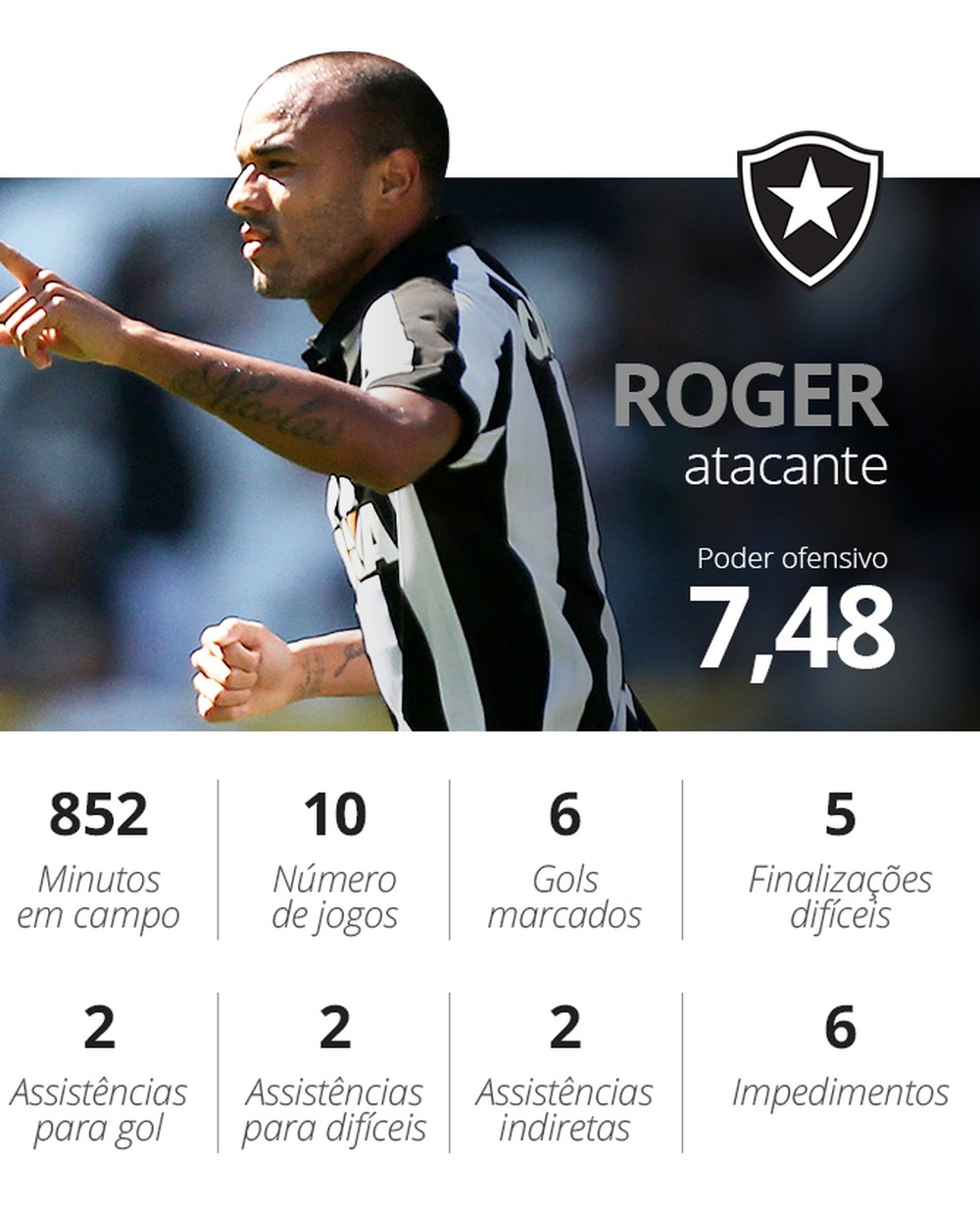 O segundo maior poder ofensivo caseiro do Brasileirão é do atacante Roger, do Botafogo, que em dez jogos (852 minutos) também conseguiu seis gols e cinco finalizações difíceis, e só não alcançou a liderança porque o peruano é mais solidário: Roger perde nos três quesitos de assistência. O atacante do Botafogo está fora do Brasileirão desde a rodada 26 porque precisou passar por uma cirurgia devido a um tumor (benigno) no rim direito.