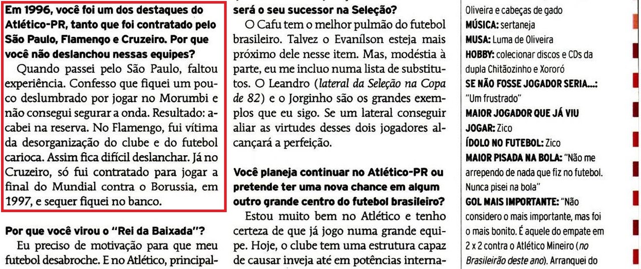– No Flamengo, fui vítima da desorganização do clube e do futebol carioca. Assim fica difícil deslanchar – declarou em trecho da "Placar" de número 1.158 (veja na imagem abaixo).