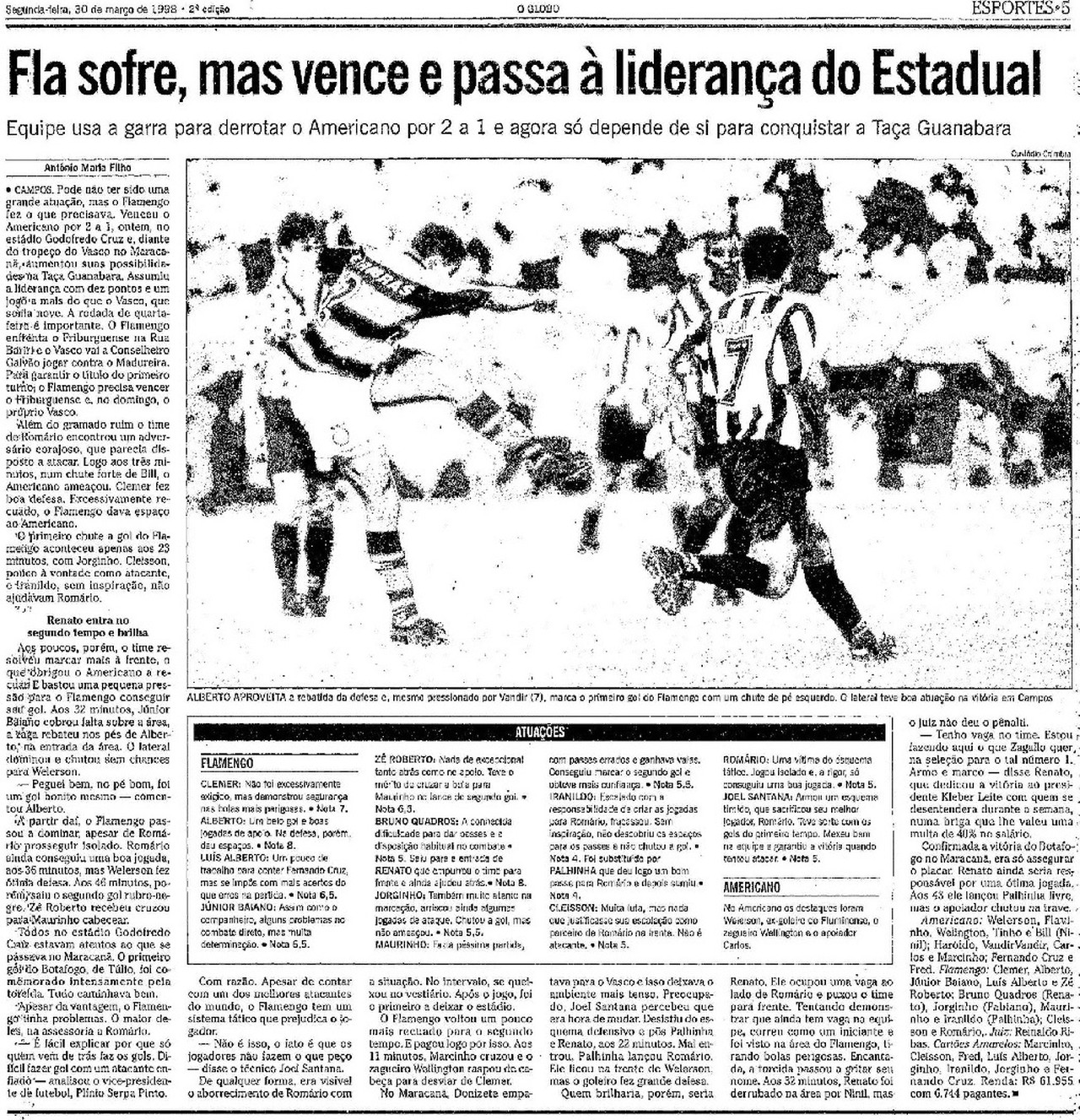 Matéria do jornal "O Globo" do dia 30/03/1998 destaca o gol de Alberto (Foto: Reprodução / O Globo)