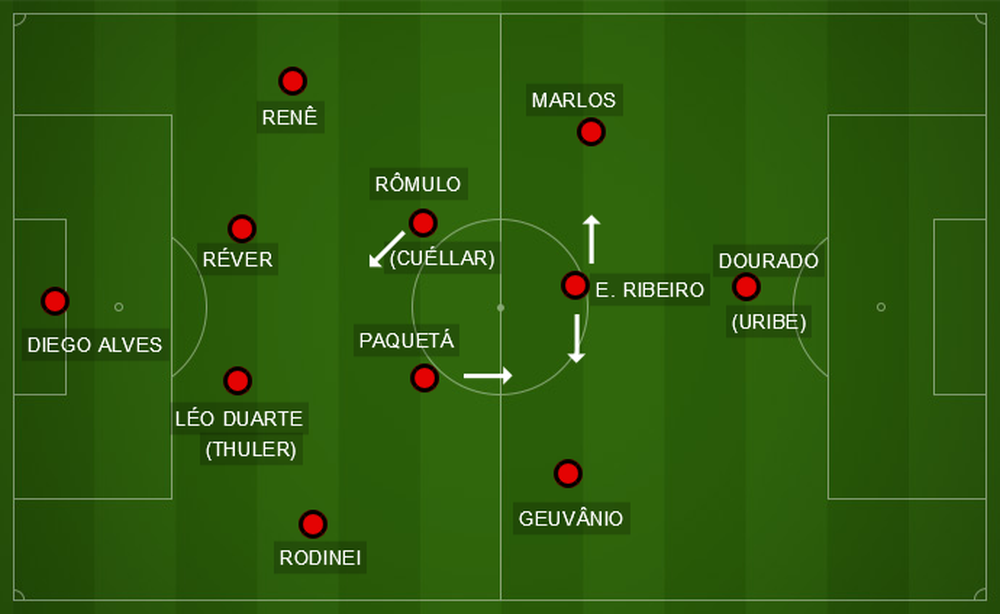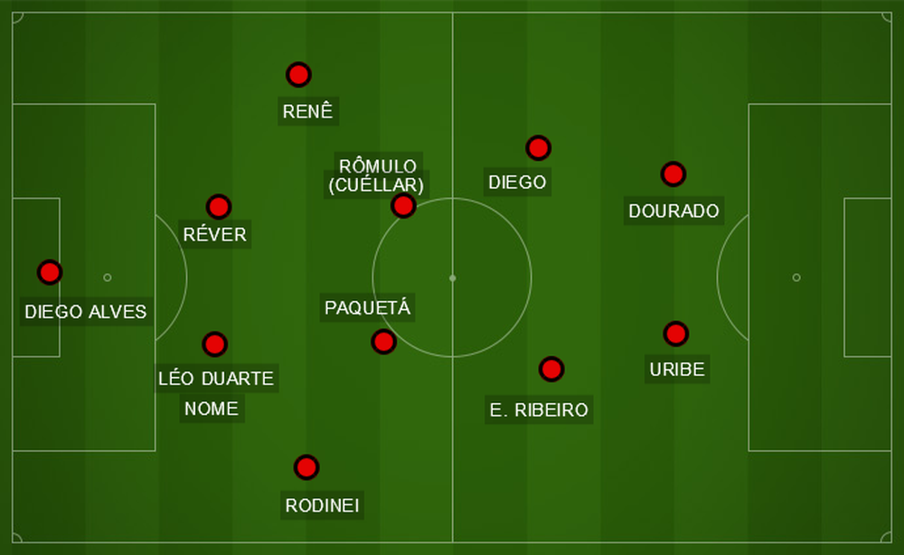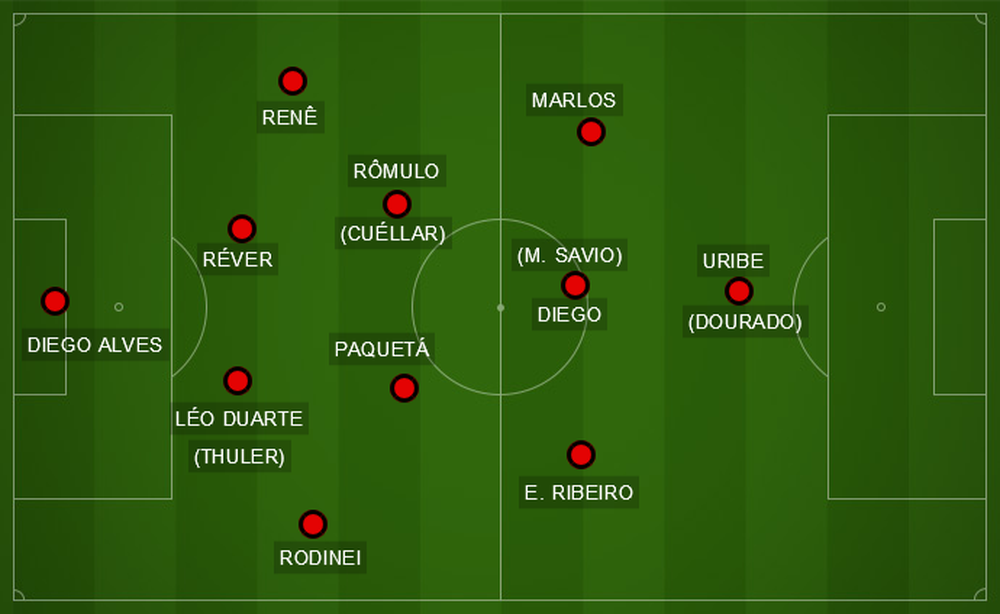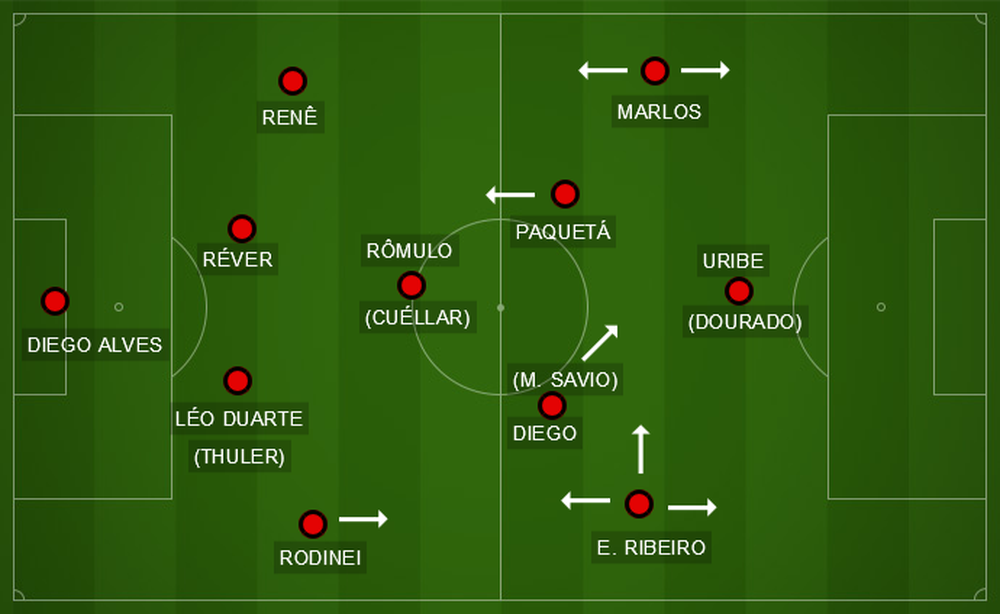 O esquema, com Rômulo (Cuéllar está fora) à frente dos zagueiros, Paquetá e Diego alinhados (Matheus Savio substitui o camisa 10 em alguns treinos quando Diego não treina), Éverton Ribeiro aberta na direita e Marlos, na esquerda, no lugar de Vinicius. Pendente da regularização no Brasileiro - o ITC de transferência precisa chegar à CBF imediatamente na data de abertura da janela (16 de julho), Uribe reveza com Dourado, que treina mais entre os reservas.