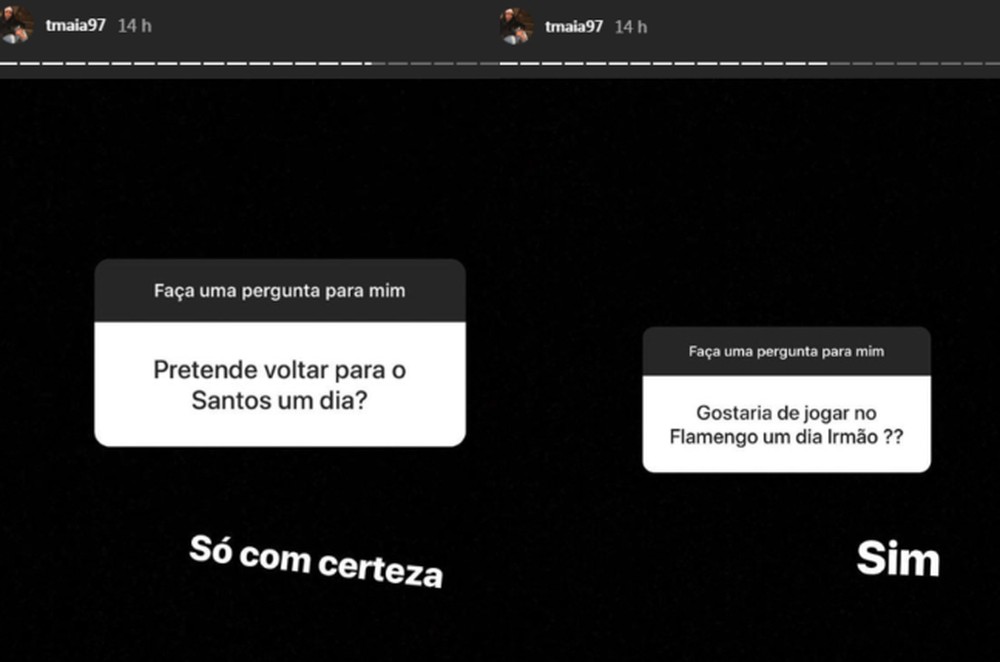Thiago Maia utilizou de uma ferramenta do modo 'Stories' do Instagram pedindo para ser questionado. Dois seguidores do ex-jogador do Santos em uma rede social perguntaram sobre o futuro do roraimense. Um deles perguntou: "pretende voltar ao Santos um dia?", ele respondeu dizendo: "com certeza". Outro questiona: "gostaria de jogar no Flamengo um dia?", e Thiago afirmou que "sim", na rede social.