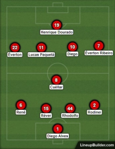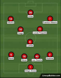 Por outro lado, Barbieri fez alterações e deu uma nova cara à equipe. Do 4-1-4-1 de Carpegiani, passou a adotar o 4-3-3, fazendo com que Diego e Paquetá atuem um pouco mais recuados e tenham uma função de ligação entre os setores.