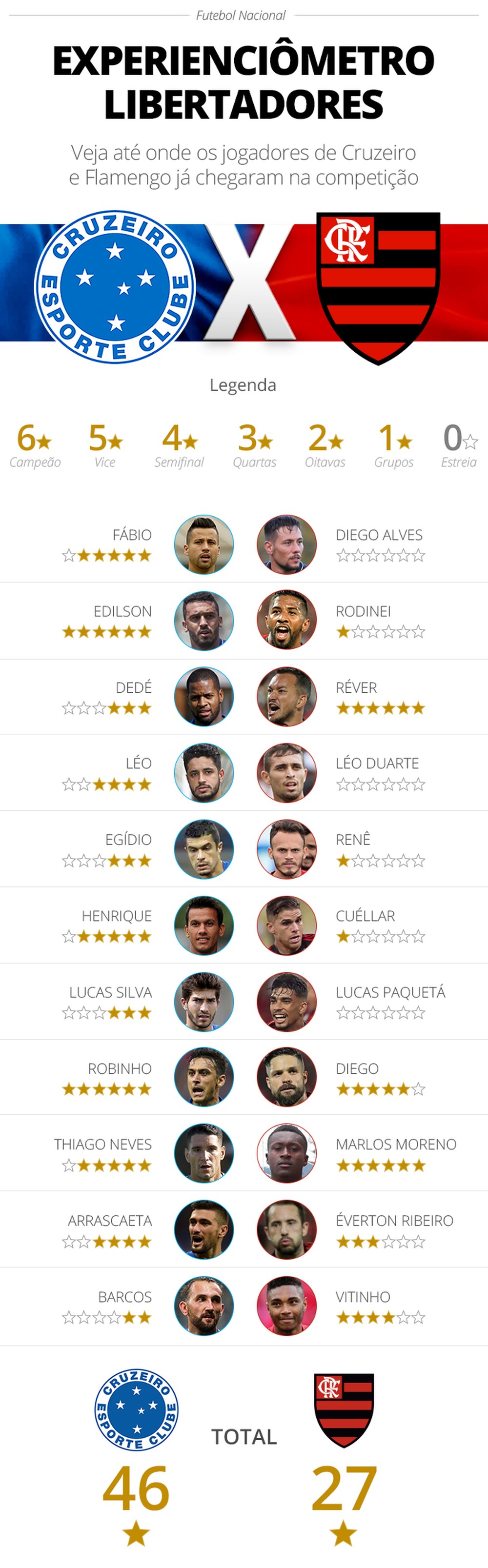 Quanto pesa a experiência do jogador em Libertadores em um duelo decisivo da competição? Controle emocional? Atalhos para conquistar o resultado necessário? Saber a hora certa de defender e atacar? Tudo isso pode ajudar, somado, claro, à qualidade técnica, às estratégias de jogo e à raça, sem dispensar uma pitadinha de sorte. Para medir a rodagem dos jogadores de Cruzeiro e Flamengo, que definem nesta quarta-feira, às 21h45 (de Brasília), no Mineirão, quem avança às quartas de final, o GloboEsporte.com criou o "Experienciômetro da Libertadores".