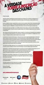"Diante das mentiras espalhadas pela chapa de oposição, nós, da Chapa Azul, nos sentimos na obrigação de vir a público esclarecer sobre o conflito relativo á inscrição das chapas concorrentes para as eleições presidenciais do Flamengo.