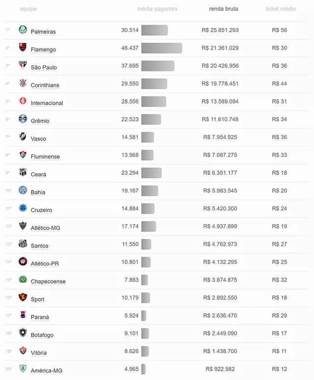 Rivais na disputa pelo título do Campeonato Brasileiro, Palmeiras e Flamengo, que se enfrentam no próximo sábado, também aparecem no topo quando o assunto é bilheteria. Assim como no Brasileirão, o Alviverde lidera no quesito, com R$ 25 milhões arrecadados. O Rubro-Negro, vice-líder na lista, tem R$ 21 milhões, mais do que as rendas brutas somadas dos rivais Vasco (R$ 7 milhões), Fluminense (R$ 7 milhões) e Botafogo (R$ 2 milhões).