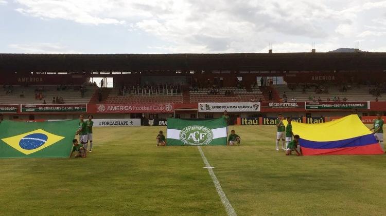 No Giulite Coutinho, bandeiras do Brasil, da Colômbia e da Chapecoense são exibidas antes de Flu x Inter (Imagem: @FluminenseFC/Twitter)