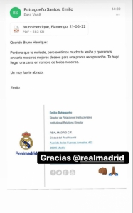 O Real Madrid se solidarizou com Bruno Henrique, que sofreu uma lesão multiligamentar no joelho direito e não atua mais no ano. Nesta terça-feira, o clube merengue enviou uma carta ao jogador do Flamengo com uma mensagem de apoio. Confira abaixo: