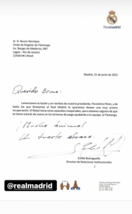 - Lamentamos a sua lesão e, em nome do nosso presidente, Florentino Pérez, e de todos que formamos o Real Madrid, queremos lhe desejar uma recuperação muito rápida. O futebol tem episódios inesperados, mas temos certeza que, em breve, estará de novo nos gramados ajudando a sua equipe, o Flamengo - diz a carta assinada por Emilio Butragueño, Diretor de Relações Institucionais do clube.