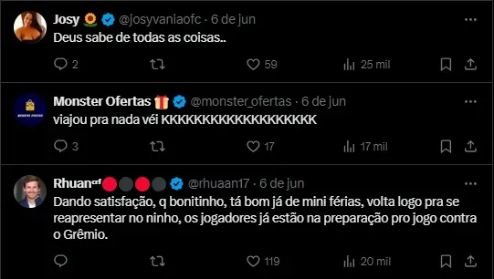 Gabi de volta ao Brasil O Flamengo ainda não sabe o que vai ser de Gabigol. A diretoria não tomou uma decisão a respeito de sua renovação após todas as polêmicas recentes envolvendo o atacante de 27 anos. © Thiago Ribeiro Gabigol comemorando seu gol durante partida entre Vasco e Flamengo, no Maracanã, pelo Campeonato Brasileiro, no dia 02/06/2024. Enquanto outro ídolo pode ganhar espaço , o atacante esteve na Suíça para participar do julgamento no CAS, por conta de uma tentativa de fraude em exame antidoping. Porém, o mesmo foi adiado, de última hora. Sendo assim, o camisa 99 tomou seu rumo de volta ao Brasil e desembarcou no Rio de Janeiro na noite da última sexta-feira (7) . A expectativa é que o novo julgamento aconteça no segundo semestre deste ano. Mal voltou e já foi treinar De acordo com o portal O Dia, Gabriel Barbosa se reapresentou na manhã deste sábado (8) , após ser liberado pela diretoria rubro-negra para ir até o país do Velho Continente por conta de sua situação. Acontece, que o jogador mal voltou em solo brasileiro, e já participou da programação da equipe do Rio de Janeiro . Ele começou nas atividades feitas na academia com seus companheiros. Após isso, o atacante também foi a campo e realizou o treinamento dado pelo treinador Tite. Sendo assim, ele estará à disposição do próximo confronto do Mais Querido, marcado para a próxima quinta-feira (13), contra o Grêmio , no Maracanã, pelo Campeonato Brasileiro. Mercado da bola e citação por rival Enquanto isso, o Mengão segue ativo no mercado da bola e um dos alvos é o atacante Michael , que já defendeu o Clube Carioca recentemente. Mas para isso terá que pagar 8 milhões de euros (cerca de R$ 46 milhões, conforme a cotação atual) ao Al-Hilal, da Arábia Saudita. O Mengão acabou sendo citado pelo zagueiro Thiago Silva em sua apresentação pelo Fluminense . O defensor que acertou sua volta ao Tricolor Carioca fez uma comparação envolvendo o Mais Querido. Reações da Nação sobre o atacante