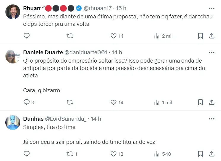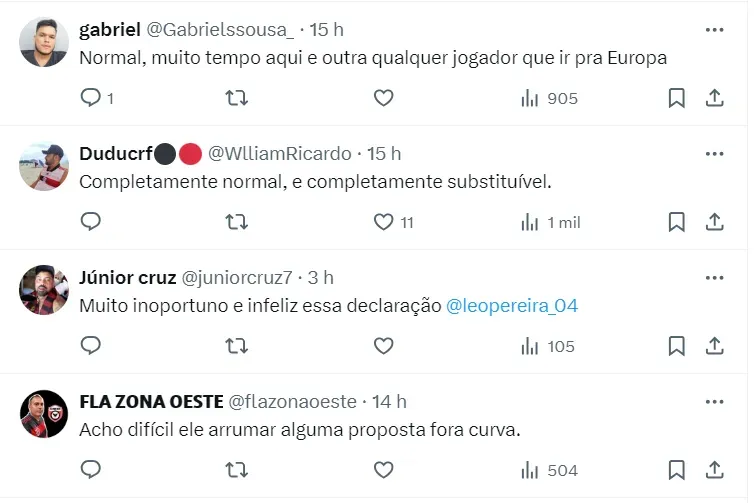 Diretoria atenta nos bastidores Flamengo sabe que vai perder jogadores importantes na próxima janela de transferência. Isso porque, os titulares da equipe vêm recebendo cada vez mais recebendo investidas, com altos valores de salário e, claro, a possibilidade de atuar na Europa, que é o sonho de muitos. © Getty Images Tite é surpreendido nos bastidores e pode perder titular no Flamengo Desta forma, entende que precisa se assegurar para conseguir receber um valor que dê condições da equipe buscar um substituto à altura no mercado. Como foi o caso de Pedro , que recebeu sondagem de clube Italiano e o Rubro-Negro estipulou valor mínimo para negociá-lo. Em contraponto, definiu que vai aguardar a situação de Gabigol , que responde por tentativa de fraudar o exame antidoping, para só depois pensar no futuro. A intenção é manter a equipe forte e com condições de brigar por títulos importantes. De saída? Quem entrou no radar para deixar a equipe carioca foi o zagueiro Léo Pereira , que se consolidou entre os titulares e é visto como uma peça fundamental do esquema tático de Tite. Ele vem vivendo um dos melhores momentos da carreira com a camisa Rubro-Negra. Diante das investidas que vem recebendo para deixa a equipe na próxima janela de transferência, o portal Coluna do Fla entrou em contato com o empresário Ricardo Scheidt, que revelou que tem planos para o jogador no futebol europeu. “Não temos nada neste momento (propostas de europeus), mas nosso objetivo sim é uma saída para ele jogar na Europa. É o sonho de todo jogador. Estou trabalhando para isso. Inclusive, tivemos uma oferta muito boa do mundo árabe em agosto do ano passado”. Os representantes analisam a situação “Se vier (nova proposta dos árabes), veremos com bons olhos também. Mas o Léo segue comprometido e focado no Flamengo. Voltou de lesão, empolgado, muito feliz com o trabalho. Sempre por mais. É um menino muito bom”, contou Ricardo. Léo Pereira tem vínculo com o Flamengo até dezembro de 2027, mas está aberto a propostas para deixar a equipe, principalmente que envolvam clubes europeus ou do mercado alternativo como árabe o Catar. Mas, apesar o desejo de atuar na Europa, o zagueiro de 28 anos, está focado na evolução do clube, enquanto o empresário vem trabalhando nos bastidores para viabilizar uma oferta internacional para o jogador. Veja a repercussão na Nação