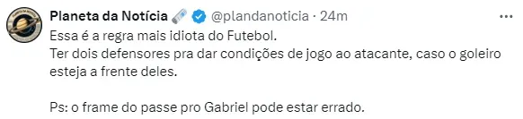 Quando a bola sobre nos pés do atacante, que manda pro gol vazio. Torcida do Flamengo está revoltada com atuação do VAR Poucos minutos após sua entrada na segunda etapa, Gabigol balançou as redes. No entanto, o árbitro Anderson Daronco marcou impedimento, e a decisão foi confirmada pelo VAR. Confira a comunicação: “Anderson Daronco: Quando cruza, tem aquele toque que eu vejo o Gabigol entre o goleiro e o zagueiro, ele tá um pouco atrás . Daiane Muniz (arbitra de vídeo): Confirmado a decisão de campo. O jogador que faz o gol está em posição de impedimento. Pode marcar”. Os torcedores expressaram forte descontentamento nas redes sociais, criticando duramente a atuação da equipe de arbitragem devido à polêmica jogada.