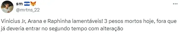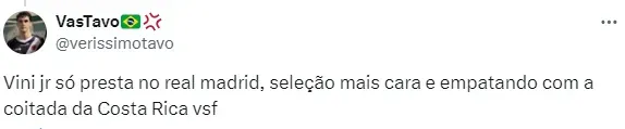 A atuação de Vini Jr. foi alvo de críticas por parte dos torcedores, que expressaram sua insatisfação nas redes sociais. Alguns comentários incluíram: “Vini jr só presta no Real Madrid, seleção mais cara e empatando com a coitada da Costa Rica”. Boa parte da seleção também foi duramente criticada, e a surpresa de Neymar com a substituição de Vini Jr. foi evidente durante a partida.