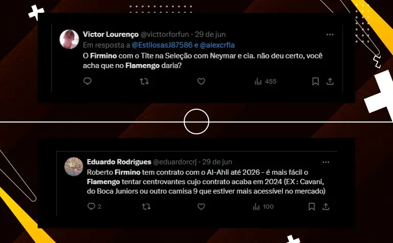 Conversas O Rubro-Negro pode perder Gabigol para Cruzeiro ou Palmeiras antes do esperado. Por este motivo, o clube já se movimenta no mercado. O Rubro-Negro conversa com o empresário de Roberto Firmino, Giuliano Bertolucci na tentativa de trazer o jogador para a Gávea. Outro clube brasileiro mostrou interesse em Firmino recentemente. O Corinthians tentou a contratação. O presidente Augusto Melo tentou o empréstimo de um ano, mas o jogador sequer abriu negociações. A intenção do Flamengo é fechar a contratação de Roberto Firmino já na atual janela de transferências. Caso a negociação seja positiva, o atleta chega para disputar posição com Pedro, atual titular da equipe. Após passagem destacada pelo Liverpoool, da Inglaterra, Roberto Firmino se transferiu para o Al-Ahli Jeddah. Em sua temporada de estreia pelo clube saudita, disputou 34 jogos, sendo titular em 27, e marcando nove gols e distribuindo oito assistências. O que dizem os fanáticos?