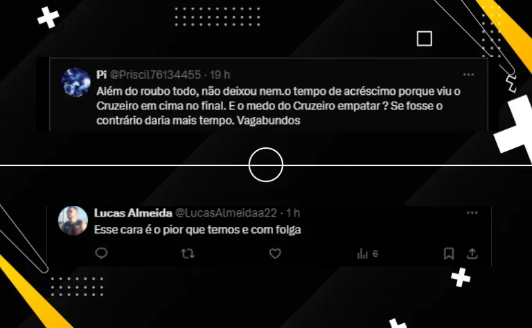 Derrota com polêmicas Jogando fora de casa, o Cruzeiro foi derrotado pelo Flamengo por 2 a 1. Matheus Pereira fez o gol da Raposa e Pedro e Fabrício Bruno fizeram os gols da equipe carioca. © Thiago Ribeiro/AGIF O árbitro Bráulio da Silva Machado durante partida entre Vasco e São Paulo no estádio São Januario pelo campeonato Brasileiro A 2023. Foto: Thiago Ribeiro/AGIF Com o resultado, o Clube Mineiro terminou a rodada em sétimo lugar, ficando com 20 pontos conquistados em 12 jogos . A equipe ainda tem um jogo a menos que a maioria dos adversários e segue na parte de cima da tabela. A derrota do time mineiro gerou muita bronca. Muitas reclamações foram feitas devido ao fato de que algumas decisões de Bráulio da Silva Machado geraram insatisfação pelo lado cruzeirense. Alguns lances geraram muito debate. Áudio do VAR em jogada Um dos lances que deu o que falar foi quando o atacante Robert teria cometido uma penalidade em cima do lateral-esquerdo Ayrton Lucas . O pênalti foi dado, porém, o árbitro foi ao VAR, reviu o lance e acabou tirando a penalidade. “Por todos os ângulos eu confirmo que realmente existe um braço no pescoço do jogador do ataque. – Ele não tem um movimento adicional, porém ele é temerário nesse braço e acaba golpeando o adversário com intensidade leve. Estão de acordo?”, disse Daiane Muniz, que estava no comando do VAR. “Tem um movimento do jogador defensor que joga a bola primeiro. Tem esse braço rosto, sim, que você narrou, porém, os dois estão em velocidade. Para o mesmo ponto onde a bola está. Os dois estão olhando a bola, tem o braço no rosto sim. Os dois estão em velocidade e o jogador de vermelho entra embaixo dele”, retrucou Adriano Assis, auxiliar de vídeo. Decisão após revisão Após a revisão da jogada, Bráulio da Silva Machado concordou com o auxiliar de vídeo e tomou a decisão de voltar atrás, anulando a marcação e retirando o cartão amarelo. “Você tem razão, Adriano. O defensor está sempre olhando a bola. Esse braço, na verdade, foi uma ação natural para o impulso de cabeceio dele. Eu refaço a minha análise. Bráulio, eu recomendo revisão para possível não-penal. Existe, sim, o braço no rosto, mas o defensor está sempre olhando para a bola. Eu entendo como não faltosa essa ação. Em nenhum momento há ação adicional do defensor” , afirmou Daiane. “ Perfeito. É um momento justificável na ação de salto. No campo tive impressão de um golpe adicional que não existe. Vou voltar com bola ao chão e retirar o cartão amarelo” , concluiu Braúlio. Reação nas redes sociais