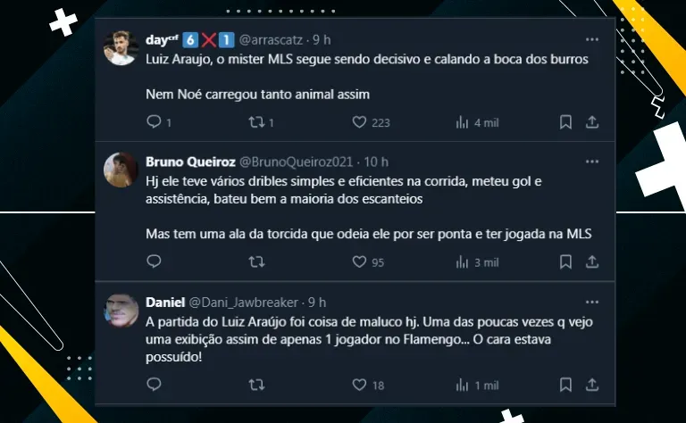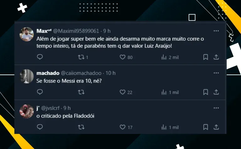 Mengão vence com show do camisa 7 Em partida realizada no Estádio do Maracanã, o Flamengo recebeu o Bolívar (BOL) com a missão de construir a maior vantagem possível para o jogo da volta, na altitude de La Paz. © IMAGO/TheNews2 Luiz Araújo comemorando gol diante dos bolivianos. No gramado, o Rubro-Negro entrou com o que tinha de melhor à disposição, com as ausências de Viña, Cebolinha e Bruno Henrique. Os dois primeiros estão machucados e o segundo, suspenso. De qualquer maneira, o Mengão conseguiu vencer por 2 a 0 e abriu vantagem na disputa por um lugar nas quartas de final . O principal nome da partida foi o do atacante Luiz Araújo, autor do gol que abriu o marcador. Pedro saiu machucado . Vale lembrar que o camisa 7 foi o escolhido por Tite para substituir Cebolinha e teve um ótimo desempenho. Além do gol, ele deu uma assistência, acertou 86% dos dribles que tentou e realizou impressionantes seis desarmes , número altíssimo para um atacante. Situação de Luiz no Fla Revelado pelo São Paulo, Luiz Araújo teve suas primeiras oportunidades entre o fim de 2016 e o começo de 2017 . Não à toa, após marcar em todos os clássicos paulistas, foi vendido para o Lille (FRA). Mesmo sem estar no PSG, conseguiu conquistar o Campeonato Francês e também teve boa passagem pelo Atlanta United (EUA). Até por isso, chegou ao Mengão por uma quantia, mas demorou a render o que o torcedor imaginava. Agora, como vem realizando bons jogos e participando de vitórias importantes do Orgulho da Nação, os torcedores passaram a elogiá-lo e, no momento, Luiz está com a moral elevada. Dito isso, de olho no jogo de volta contra o Bolívar (BOL), a tendência é que o Rubro-Negro poupe os titulares do clássico do final de semana, quando terá que encarar o Botafogo. Flamenguistas falam de Luiz Araújo