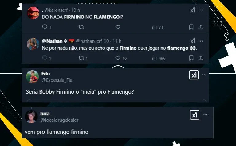 Vale deixar exposto também que o Palmeiras é o time brasileiro que mais sondou Firmino neste início de ano. Afinal, os comandados de Abel Ferreira estão buscando um centroavante há algum tempo . Torcida do Flamengo e Filipe querem a chegada de Firmino Segundo informações do jornal ‘O Dia’, a novidade envolvendo a carreira de Roberto Firmino chegou ao Mengão, e Filipe Luís resolveu pedir oficialmente sua contratação. O ex-Liverpool ganhou ainda mais força internamente. Por fim, por mais que nenhuma negociação esteja oficialmente aberta, a Nação aproveitou o momento para dar uma “cutucada” em José Boto, que não fez contratações bombásticas neste início de gestão. Confira os comentários: PUBLICIDADE PUBLICIDADE