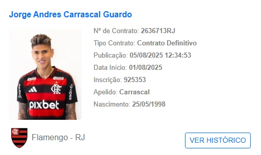 Anunciado pelo Flamengo no último sábado (2), o meio-campista Jorge Carrascal foi regularizado no Boletim Informativo Diário (BID) da CBF e está apto a estrear pelo clube. No entanto, a primeira partida não será diante do Atlético-MG, nesta quarta-feira, às 19h (de Brasília) pelo jogo de volta da Copa do Brasil. Isso porque o colombiano não está presente na lista de relacionados do técnico Filipe Luís. Apresentado na última segunda-feira (4), o jogador de 27 anos participou pela primeira vez do treino com o elenco rubro-negro também na tarde de ontem.