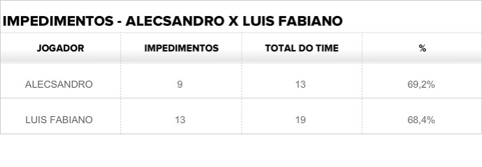 Alecsandro tem números muito parecidos ao de Luis Fabiano. Cada um deles marcou dois gols no Brasileirão 2014, além de ter uma proporção de impedimentos em relação ao time de quase 70%. O camisa 19 do Flamengo foi flagrado em posição irregular por nove vezes - 69,2% do total da equipe - enquanto LF9 ficou à frente da linha de defesa em 13 oportunidades, numa relação de 68,4% em relação à equipe do São Paulo.