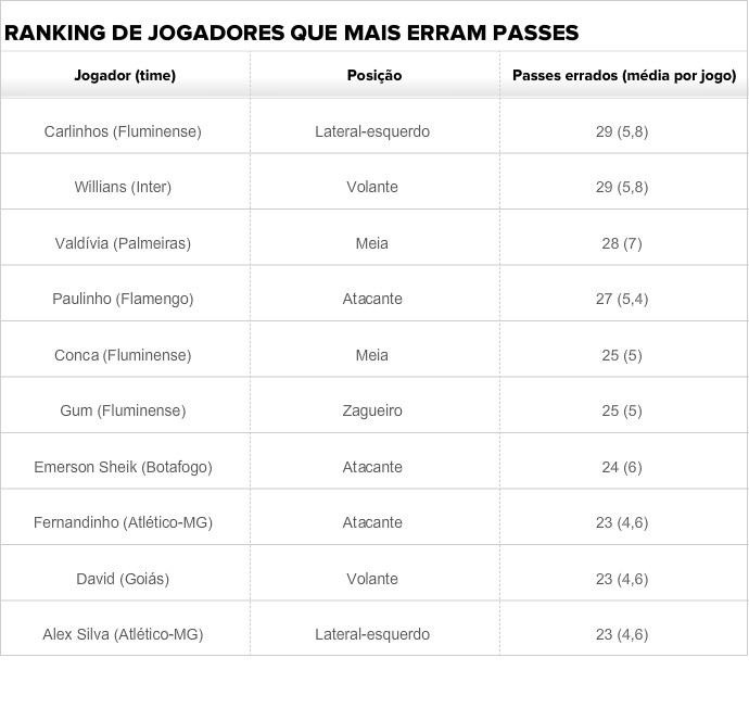 Com estilo ofensivo e de troca de passes rápida, o Fluminense está no topo da lista. No total são 207, média de 41,4. Tem três jogadores entre os 10 que mais erram. O primeiro é Carlinhos, com 29 passes que não chegaram a um companheiro (média de 5,8 por jogo). Conca e Gum, os dois com 25 (média de 5 por jogo), estão empatados em quinto. O meia Wagner entende que o estilo ofensivo pode contribuir para que ocorram mais erros.