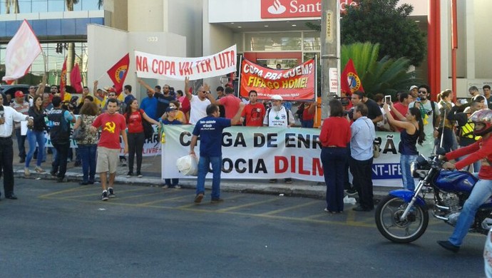 A mobilização inclui militantes de partidos políticos e servidores de sindicatos em greve. A princípio, o protesto era realizado no canteiro central da Avenida República do Líbano, em frente ao hotel onde a Seleção está concentrada. Posteriormente, os manifestantes foram obrigados pela polícia militar a deixar o local. Neste momento houve confusão, e Daniel Kraucher, de 28 anos, foi retirado a força e levado para uma viatura da PM.