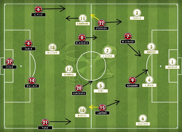 Luxemburgo tirou Arthur Maia e colocou Alecsandro. Everton foi para o centro, atrás do centroavante, e Cirino seguiu à esquerda. O camisa sete atraiu a marcação e serviu Anderson Pico, que desceu por dentro e acertou chute preciso.