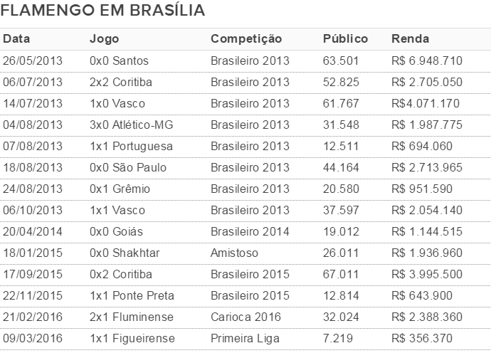Confira abaixo todas os públicos e rendas do Flamengo em Brasília em jogos realizados após a reforma do Mané Garrincha: