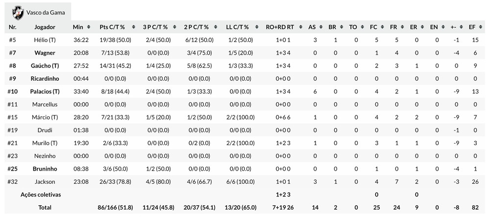 Com 25 pontos, Marquinhos foi o cestinha do Flamengo. Ele também pegou seis rebotes e deu sete assistências. Outros destaques do Flamengo foram o pivô Olivinha, com seu 14º duplo-duplo em 23 jogos. Ele anotou 16 pontos e pegou 11 rebotes. Os rebotes, por sinal, podem ter feito a diferença para o Rubro-Negro. Só Olivinha teve sete ofensivos, enquanto o Vasco inteiro pegou sete. Armando a equipe, Fischer fez 18 pontos e teve aproveitamento de 72% nos arremessos. No Vasco, voltando após lesão, David Jackson foi o cestinha do jogo com 26 pontos. Hélio anotou 19, e Gaúcho ajudou com outros 14. O Cruzmaltino entrou em quadra com importantes desfalques. Com lesão da panturrilha, o pivô Bruno Fiorotto sequer viajou para Manaus. Já Nezinho não entrou em quadra devido a uma sobrecarga muscular.