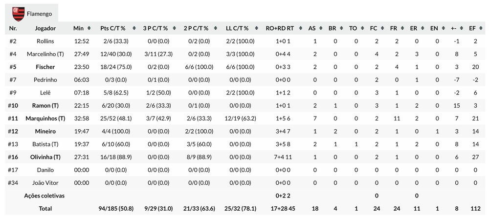 - Não adianta ficar lamentando as ausências. Com tudo isso, poderíamos ter vencido. Pecamos nos rebotes, essa foi a nossa maior falha. Tomamos 94 pontos. E aí é difícil você ganhar um jogo, fazer 95, 96 pontos jogando com uma equipe como o Flamengo. Temos que levar para casa um aprendizado que com tudo isso, ainda poderíamos ter vencido o jogo - disse o pivô Murilo.