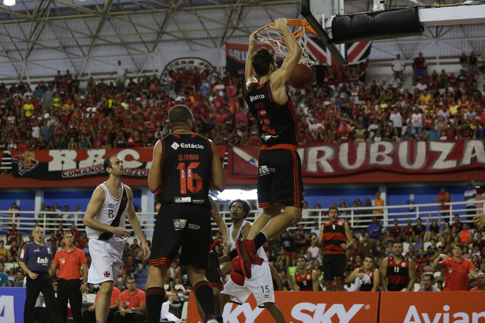 A chuva que caiu forte em Manaus atrasou o clássico entre Flamengo e Vasco, pelo Novo Basquete Brasil. Mas quem disse que o rubro-negro reclamou? Ao lado da torcida e com a arquibancada rival calada, o time da Gávea jogou no embalo de Marquinhos e Fischer e teve a sua revanche tão esperada, lavando a alma diante do arquirrival. Desde a volta do Cruz-Maltino à modalidade, não havia acontecido ainda um jogo oficial com a presença das duas torcidas. Desta vez foi assim, e o Flamengo, líder do NBB, levou a melhor por 94 a 86 depois de uma partida equilibrada nos três primeiros quartos e de domínio vermelho e preto no período final. Para festejar, Marquinhos, Olivinha e cia se jogaram nos torcedores, em uma comemoração acima do normal, com Olivinha pegando o microfone e cantando "Isso aqui não é Vasco, isso aqui é Flamengo".