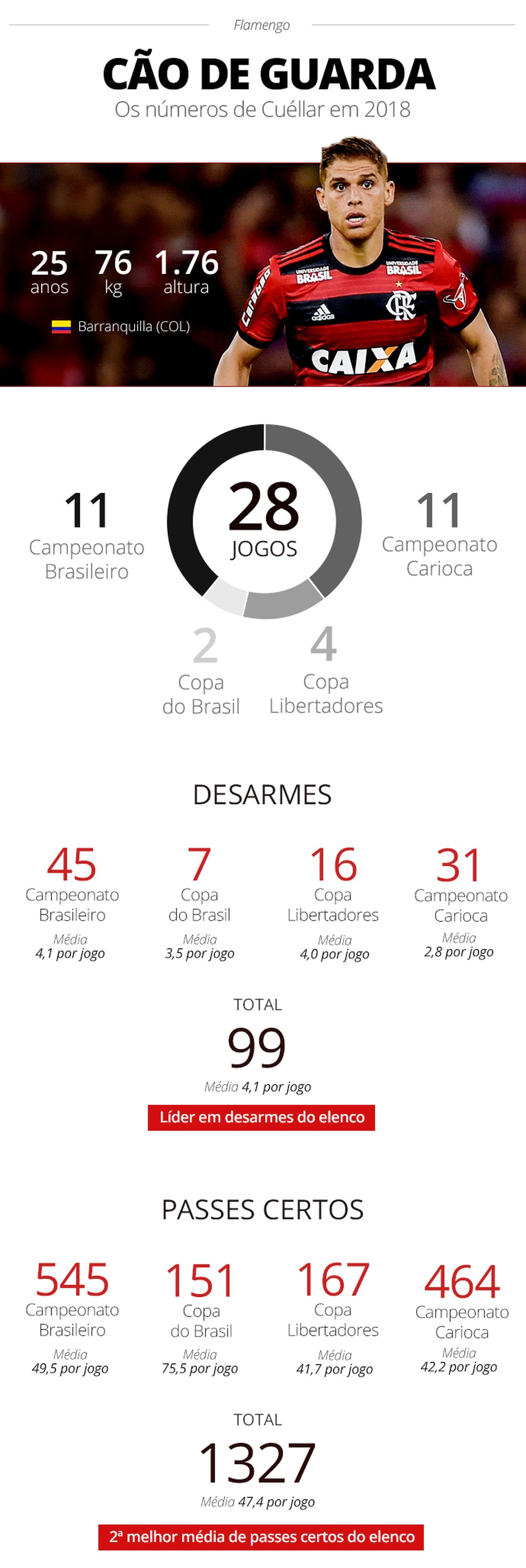 São poucos os jogadores que podem bater no peito e se gabar do status de intocável no time titular do Flamengo. Mas, entre eles, um desponta, cada vez com mais moral com a comissão técnica e com os torcedores. Desde 2016 no clube, Cuéllar usou a regularidade como trunfo e aliou qualidade técnica com entrega para cair nas graças da torcida.
