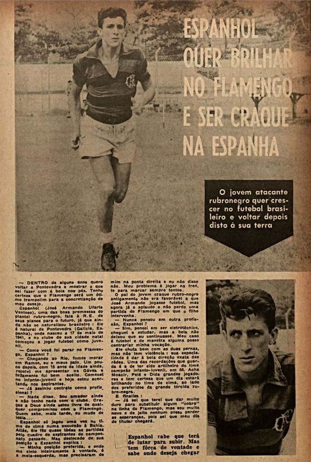 Já o segundo foi o atacante José Armando Ufarte Ventoso, apelidado por aqui de "Espanhol". Apesar de ser estrangeiro, ele passou a infância no Brasil e começou a jogar pelo Flamengo ainda na base em 1958. Três anos depois, subiu para o profissional e vestiu a camisa rubro-negra entre 1961 e 1964. Ao todo, ele disputou 106 partidas, marcou 15 gols e conquistou dois títulos: o Rio-São Paulo de 61 e o Campeonato Carioca de 63.