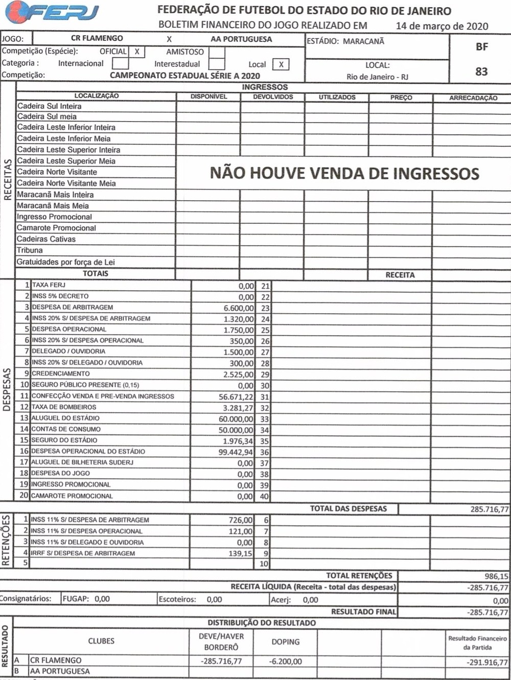 A última partida do Flamengo no Campeonato Carioca foi de prejuízo financeiro para o clube. Realizado a portões fechados, o jogo contra a Portuguesa, vencido por 2 a 1 no último sábado, no Maracanã, teve resultado financeiro negativo de R$ 291.916,77.
