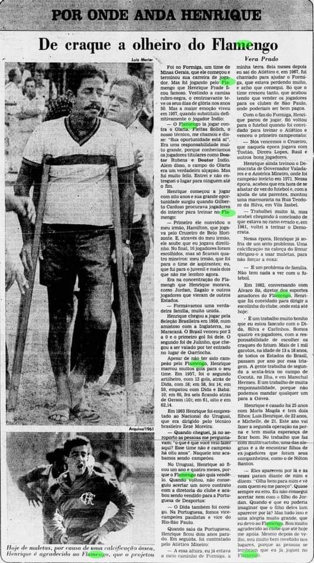 - Ele era um centroavante forte, jogava dentro da área, brigava dentro da área. Era um ponto de referência. Um cara alto, forte, valente e goleador. Fazia dupla com o Dida, que recuava mais - lembrou o meia Gerson, o Canhotinha de Ouro, que, vindo da base do Flamengo, atuou com Henrique no início dos anos 60.