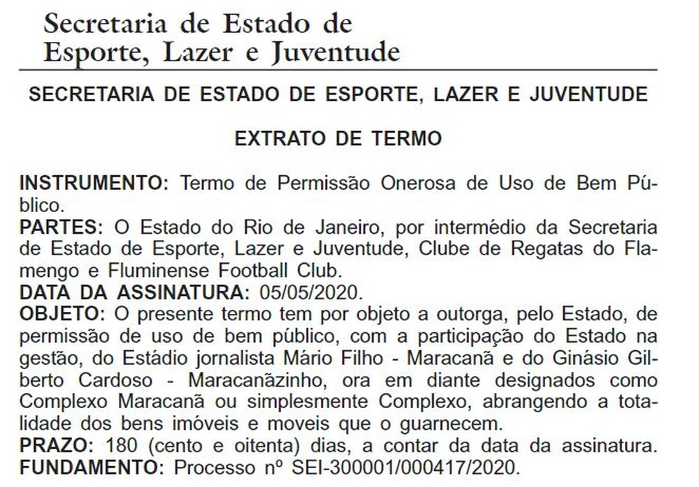 Flamengo e Fluminense assinaram nesta semana, junto ao Governo do Estado do Rio de Janeiro, um novo termo de permissão de gestão do Maracanã. A informação foi dada pelo site "O Globo". A assinatura ocorreu na última terça-feira e foi publicada no Diário Oficial nesta quinta. O novo acordo é de mais 180 dias, sendo válido até novembro de 2020.