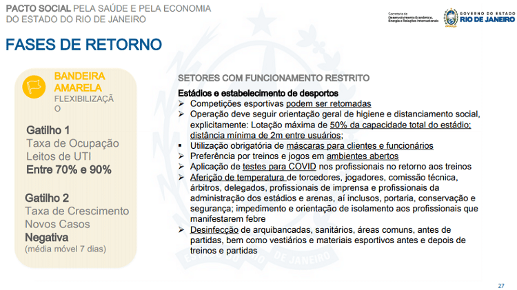 Para efeito de comparação, o Maracanã, que tem 78.838 lugares, poderia, então, receber cerca de 39 mil pessoas. O texto fala em isolamento de 2 m e aferição de temperatura, mas foi duramente criticado pela opinião pública e vozes dissonantes dentro do futebol, como os presidentes de Fluminense e Botafogo.