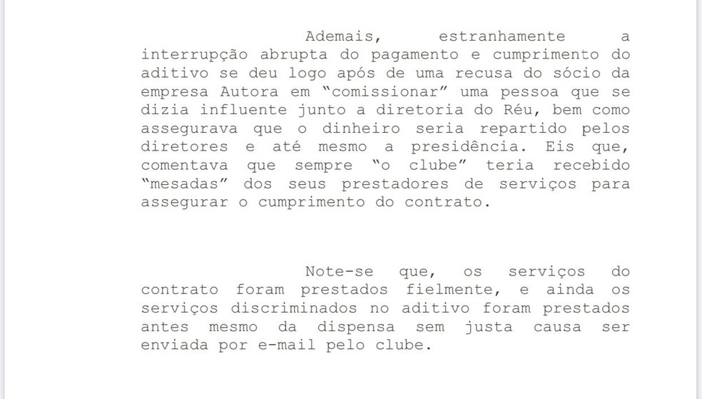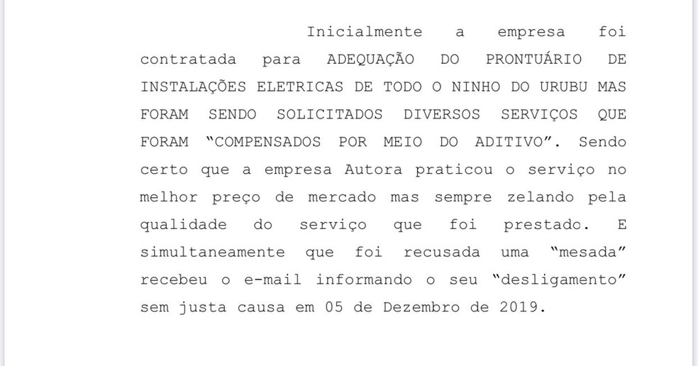 Na ação, a Anexa Serviços de Eletricidade Ltda questiona a ruptura da parceria para "adequação de prontuário de instalações elétricas" e indica que a mesma aconteceu sem justa causa e simultaneamente à recusa de uma "mesada" em 5 de dezembro de 2019. O texto da ação diz ainda que a empresa "se recusou a "comissionar" uma pessoa que se dizia influente junto à diretoria, bem como assegurava que o dinheiro seria repartido pelos diretores e até mesmo a presidência".